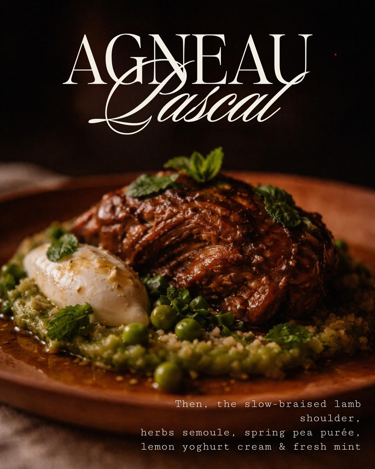 Shoulder of lamb, braised low and slow until it falls apart. Served over a herb semoule — light, fragrant, threaded with fresh mint and parsley. Spring pea purée alongside, bright green and alive. A lemon yoghurt cream on the side, cool and citrusy. This is the heart of the evening.